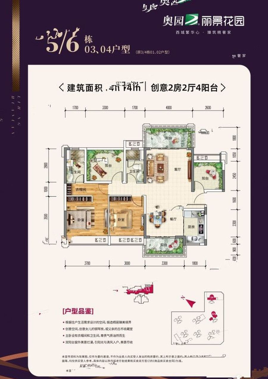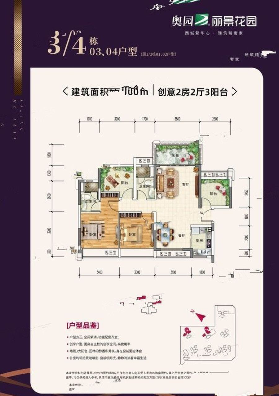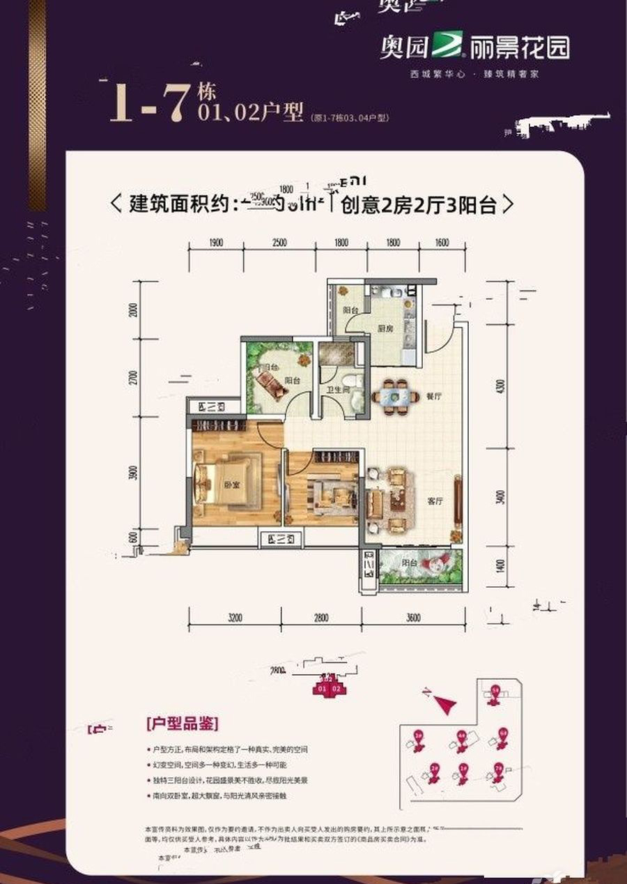 奥园丽景花园小区占地面积2.8万平方米,总建面6.5万平方米,总户数464户,地上停车位59个,地下停车位422个,绿化率达到35%,容积率仅为1.6,我们的项目共8栋,整体分为两个业态,其中住宅产品为1-7栋,均为2+1或2+2创变户型;8栋为2层商业,另外包含1栋、2栋、7栋1层住宅底商。小区住宅整体呈两排设计,前排与后排错开而建,5栋位于北侧,整体布局使得每一栋的采光通风效果、视野得到最好的享受。小区有两个车行路口,南侧的河坊路和西侧规划路各一个,采用人车分流设计,一方面能减少粉尘,噪音的影响,另一方面也保证了小区的安全性。