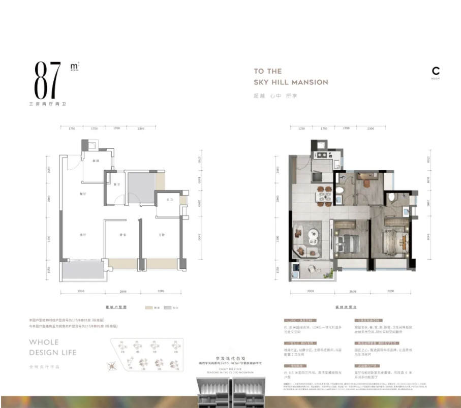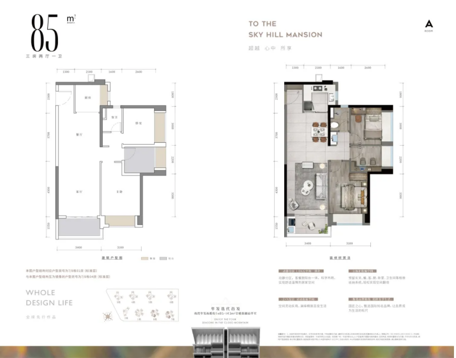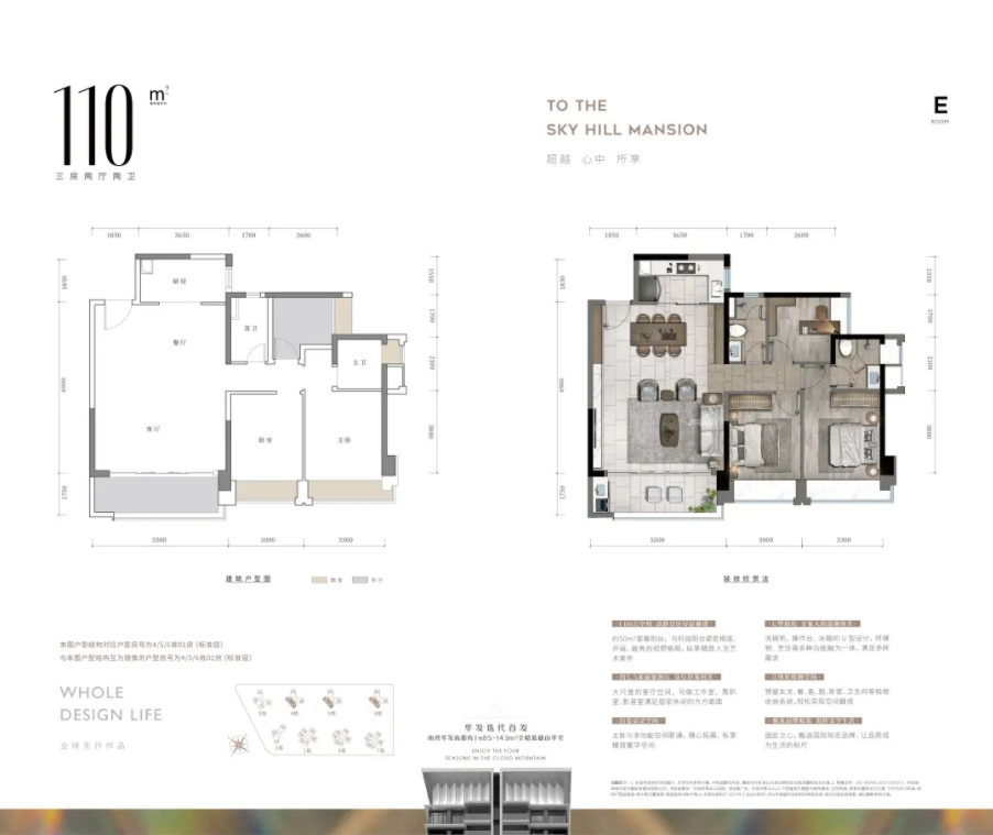 南向奢阔三房,客、餐厅开间达到 5.5 米,客厅完 全打破过往沙发+电视的格局,约 50 ㎡客餐厨阳台 LDKG 设计,构建出一个霸气 的家庭活动核心区。厨房充分预留了配置中西厨的条件,而这种尺度在市场上需 要至少 150 方以上的户型才有可能实现。