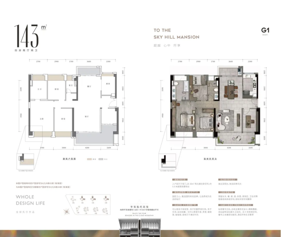 南北通透,四开间朝南,舒适度不言 而喻,将客厅扩展至 6.8 米的大开间,约 9 米的进深,南北双阳台设计,保证了 自然采光和通风条件都是最佳,双向采光瞰景。143 ㎡户型的交付标准是整个小 区里最高的,奢阔主卫空间,双台盆、配备独立 PG 浴缸、独立淋浴区。