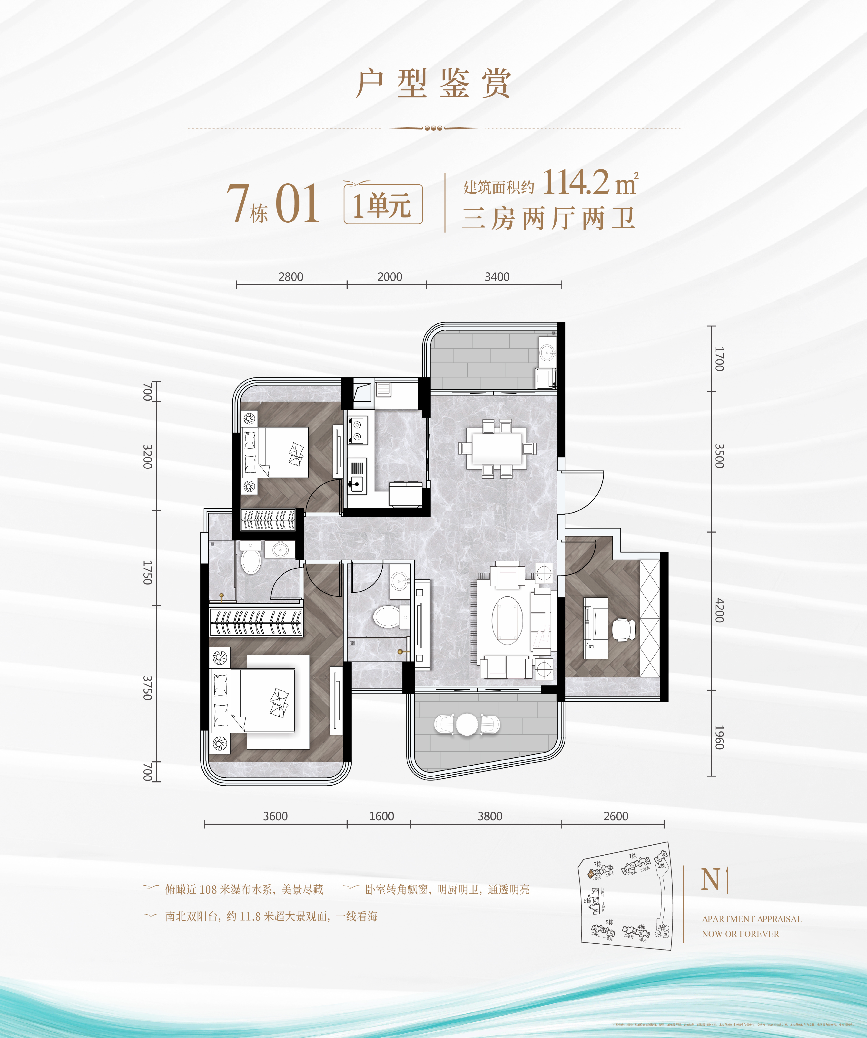 俯瞰近108米瀑布水系,美景尽藏 卧室转角飘窗,明厨明卫,通透明亮 南北双阳台,约11.8米超大景观面,一线看海