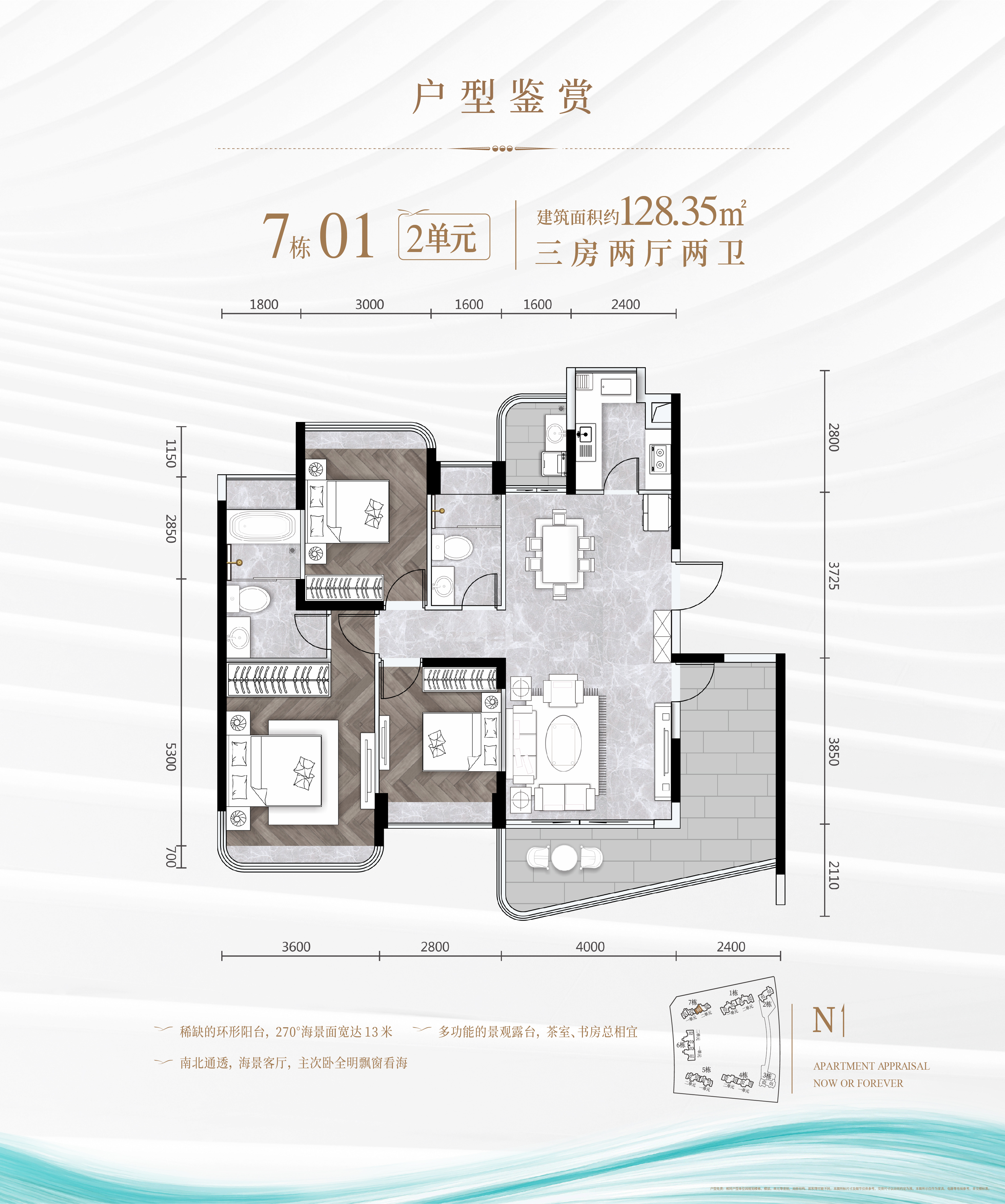 稀缺的环形阳台,270°海景面宽达13米 多功能的景观露台,茶室、书房总相宜 南北通透,海景客厅,主次卧全明飘窗看海